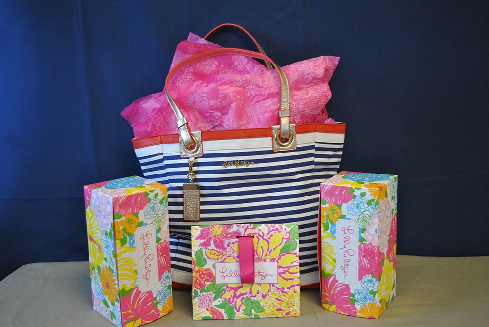 A delightful assortment of Lilly Pulitzer items in a blue and white striped canvas tote/beach bag with leather trim. Signature Lilly items include a travel mug, cell phone wallet, and makeup/toiletries pouch.