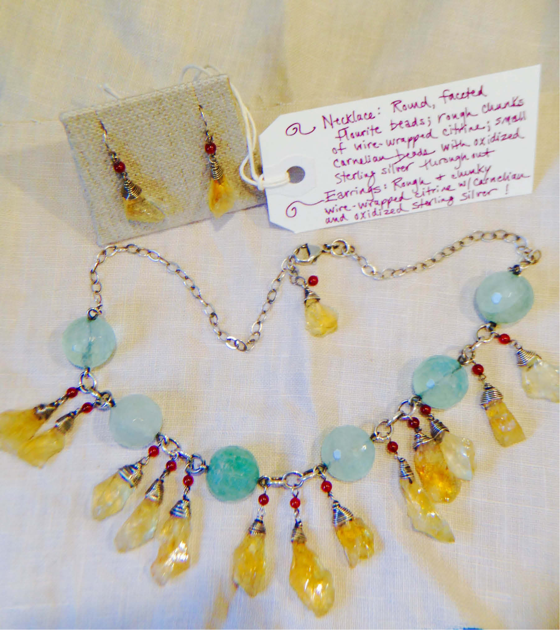 Beautiful handmade necklace and matching earrings by local artist Rebecca Segall. Each unique piece is made of sterling silver with semi-precious gems and finished with oxidized silver wire wrapped at the top of every stone.