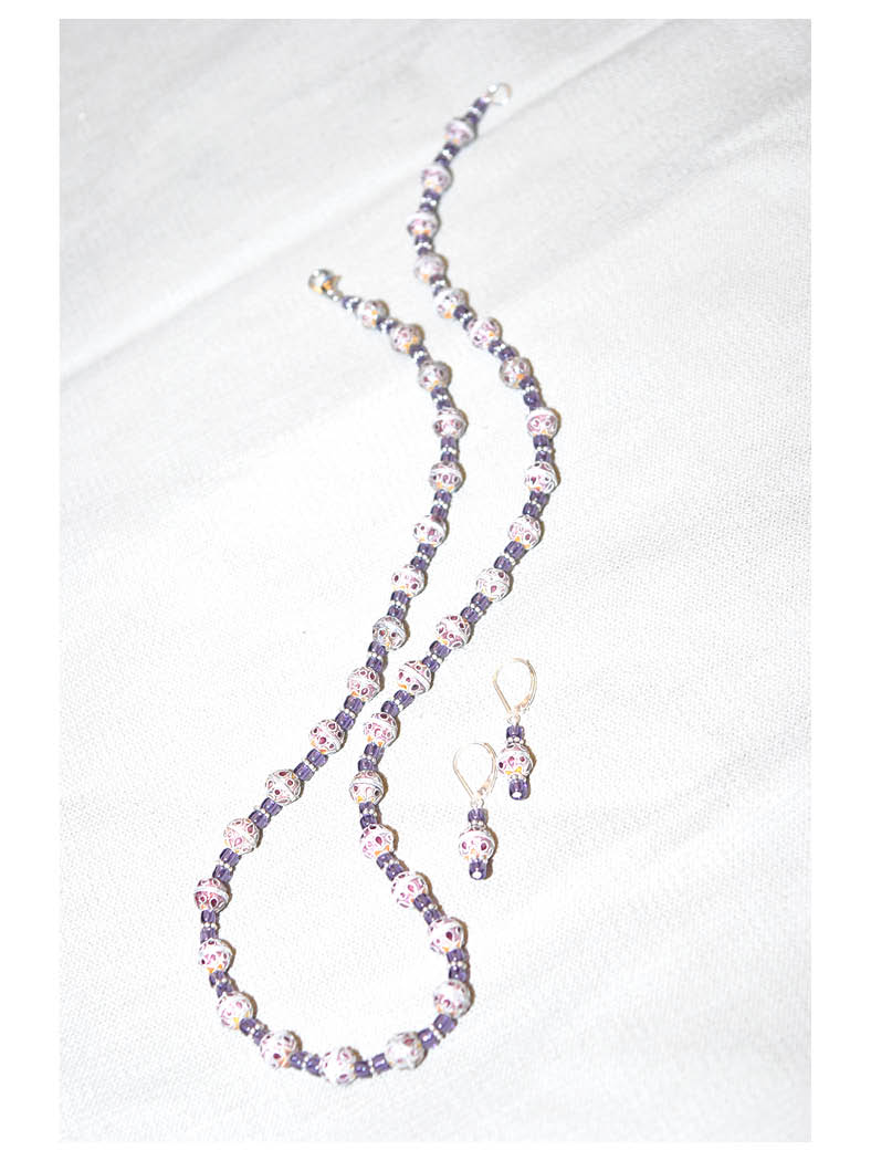 Wear these beautiful matching pieces by parent of alumni and staff member, Lynette Assarsson. This necklace and earring ensemble showcase sterling silver with lavender and sterling silver cloisonne beads. Great for any age!