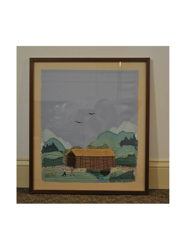 Needlework art of the old covered bridge over Chester Creek at Westtown Road created by Penni Briggs '38. The history of the piece is that for "check-out" the girls were permitted to walk on Westtown Road to the Covered Bridge and back. At the bridge, the girls would make a wish and then try to walk across without taking another breath. If you made it, your wish would come true.