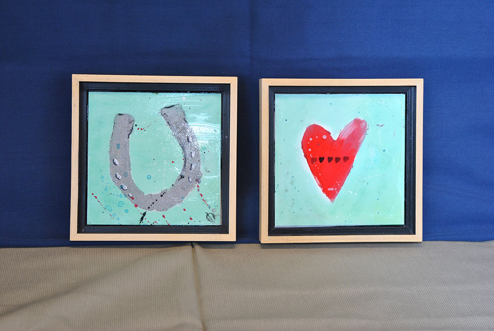 Two 8" x 8" framed paintings created by local West Chester artist Katee Boyle Mojica. Enjoy these sweet, lucky and loving pieces in your home.