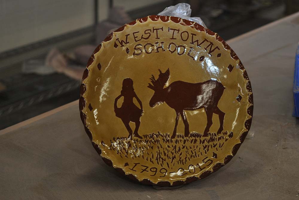 This one-of-a-kind ceramic pie plate was handmade by Emelia Brenneman '15. Pie plates are a part of Westtown history and Emelia's design is an image of a dancing girl with a moose. Apple pie included.