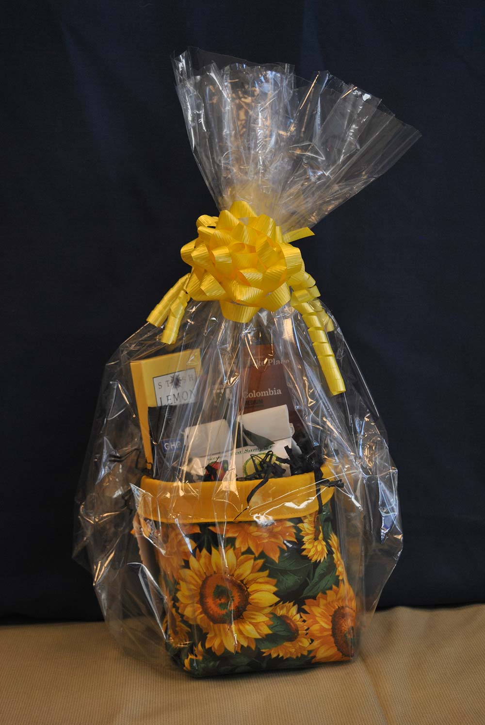 Handmade fabric gift bag filled with coffee, tea, and hot chocolate. The sunflower print gift bag is reusable and this size can be used as a decorative cover for a small, square tissuebox.